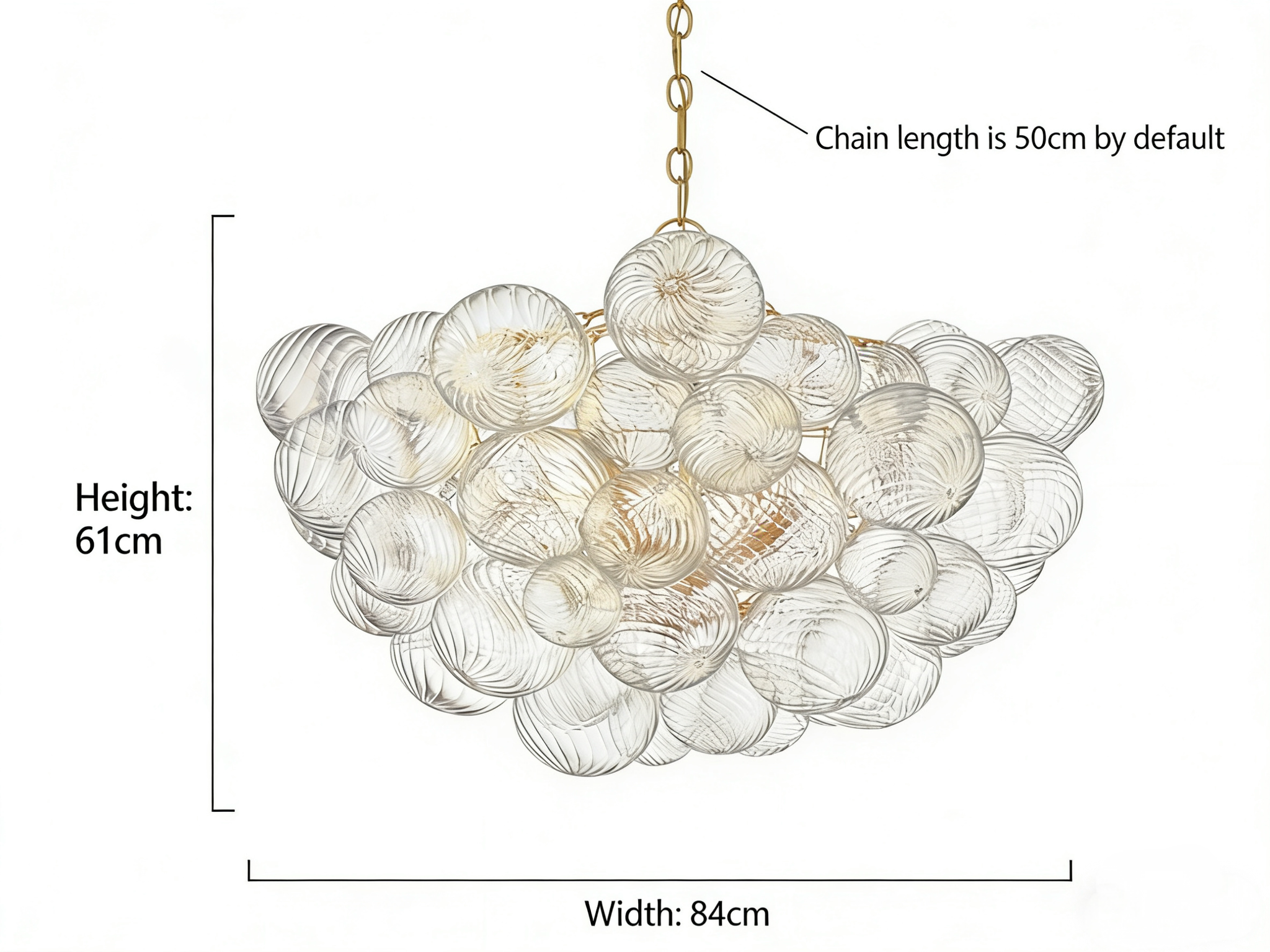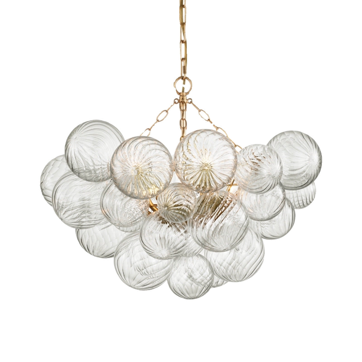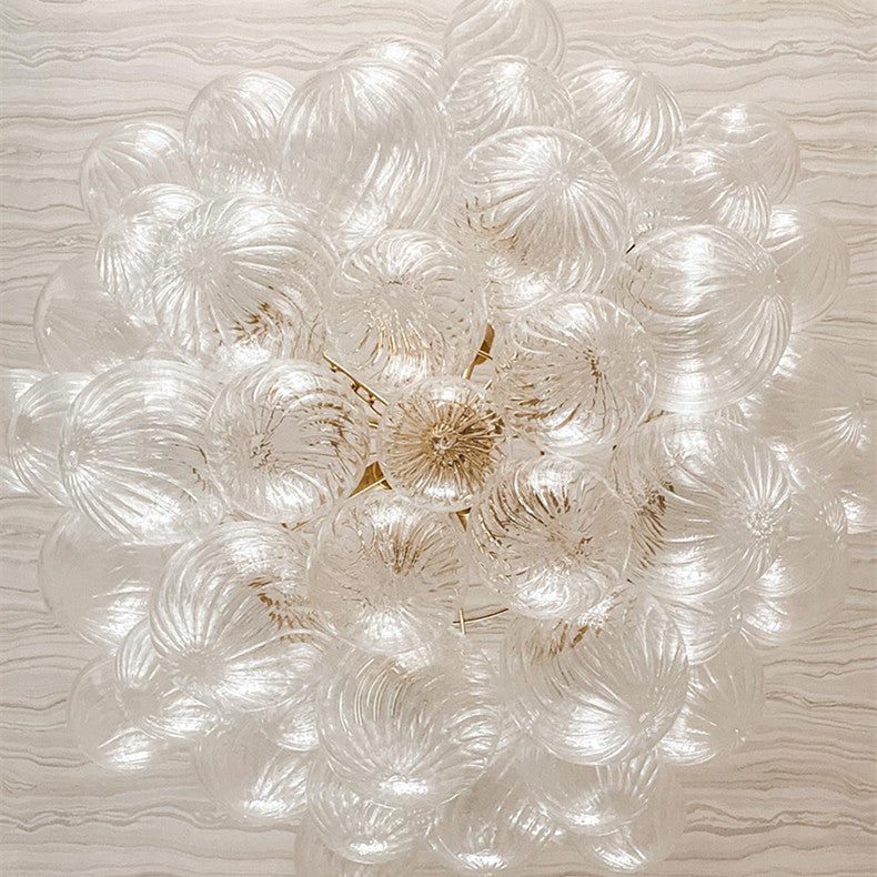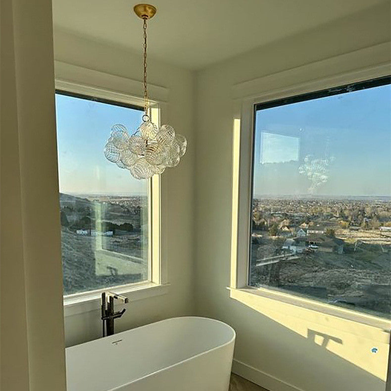 Elevate your interior design with the ethereal beauty of our Swirl Glass Bubble Chandelier. This show-stopping centerpiece features a cascading cluster of hand-blown glass spheres, each meticulously detailed with a delicate spiral texture that captures and refracts light across the room.