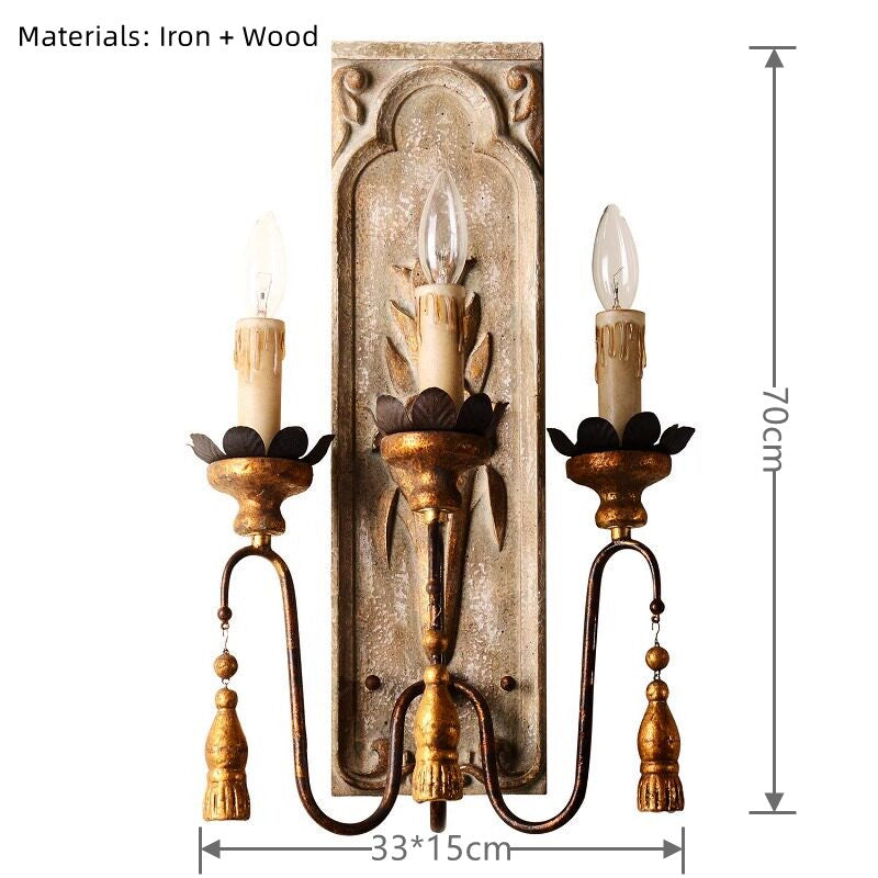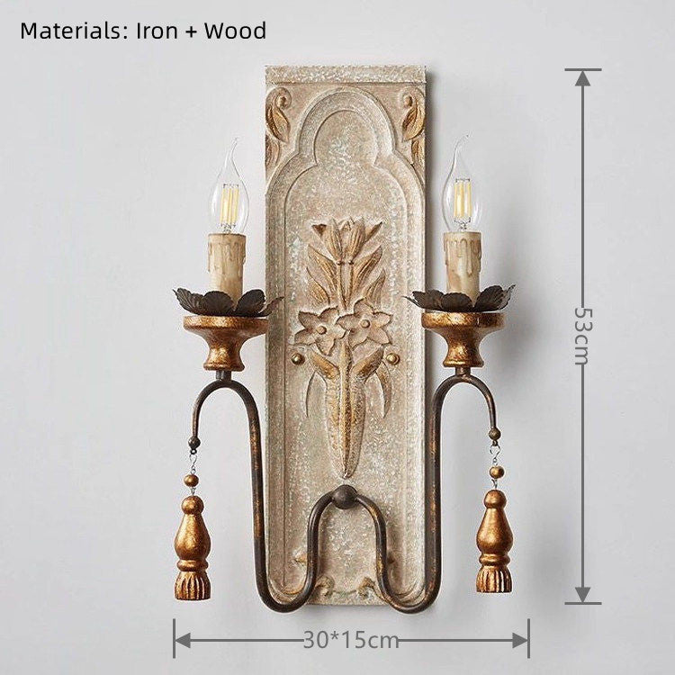 Bring timeless elegance to your home with this exquisite French Country Wall Sconce. Designed to blend artistic craftsmanship with functional lighting, this wall sconce features a beautifully distressed off-white backplate adorned with intricate floral carvings, reminiscent of classic European architecture. The dual candle-style lights are supported by elegantly curved metal arms in an antique gold finish, accented with charming tassel-shaped pendants for a touch of whimsy.