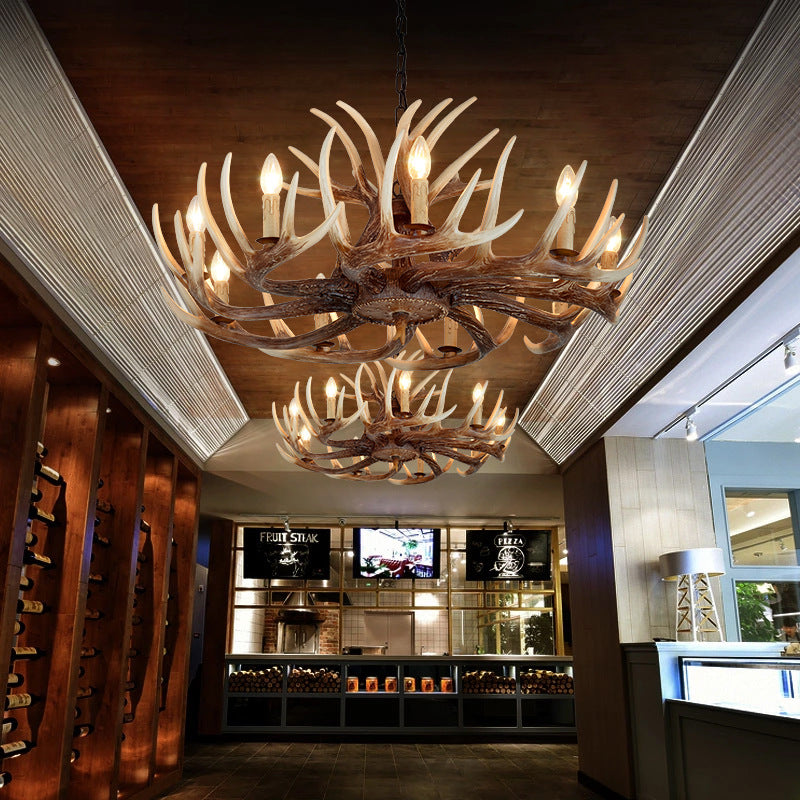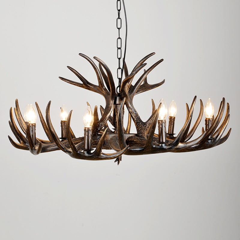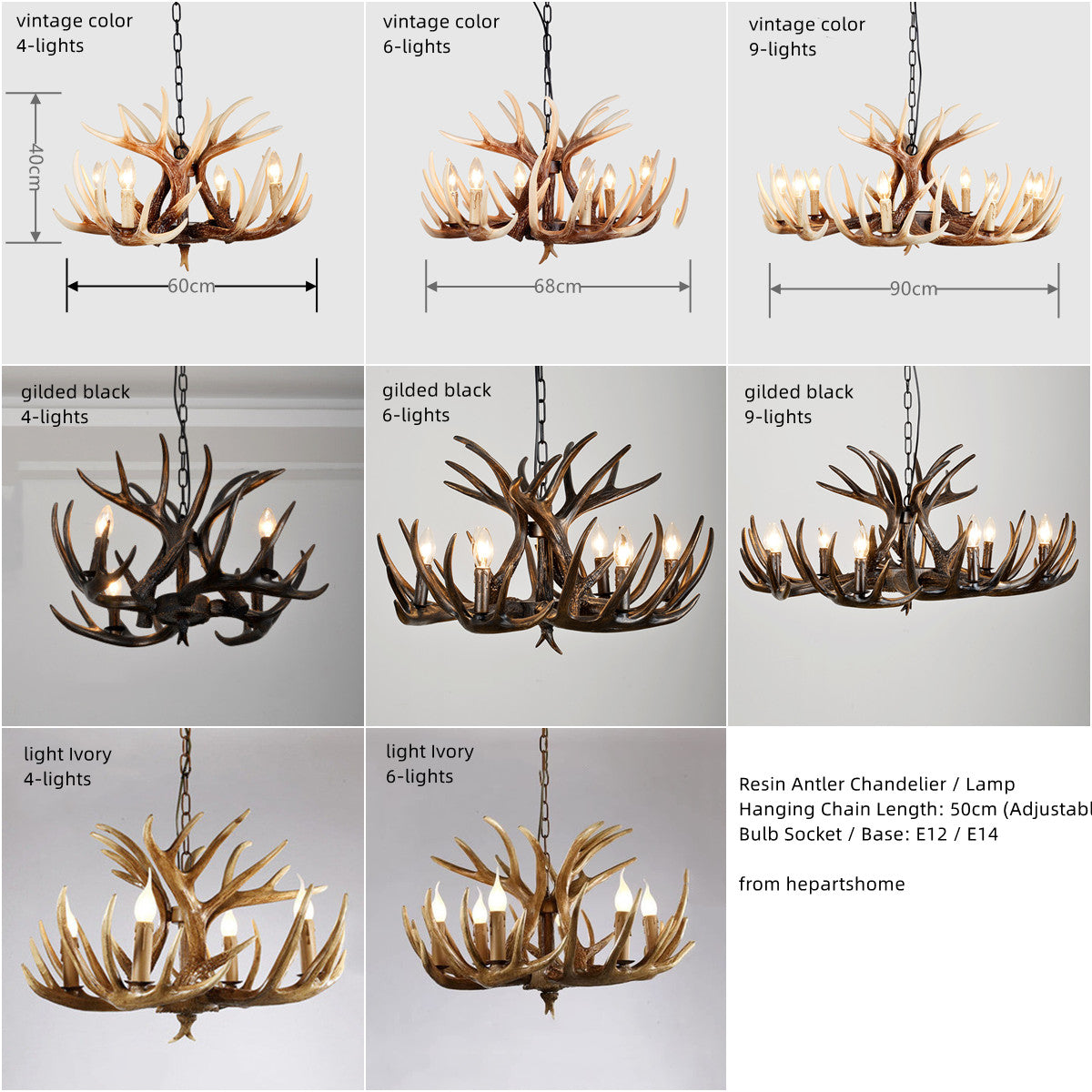 Crafted from durable resin, this chandelier realistically captures the texture and natural appeal of real deer antlers. The fixture features a hand-applied vintage finish (or "distressed finish"), giving it an aged, authentic look. It provides ample illumination with 4-9 candlestick-style light holders, creating a warm and inviting glow for dining rooms, living areas, or grand entryways. The included robust chain allows for adjustable suspension height, making it adaptable to various ceiling heights.