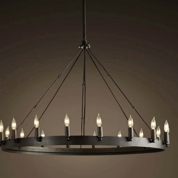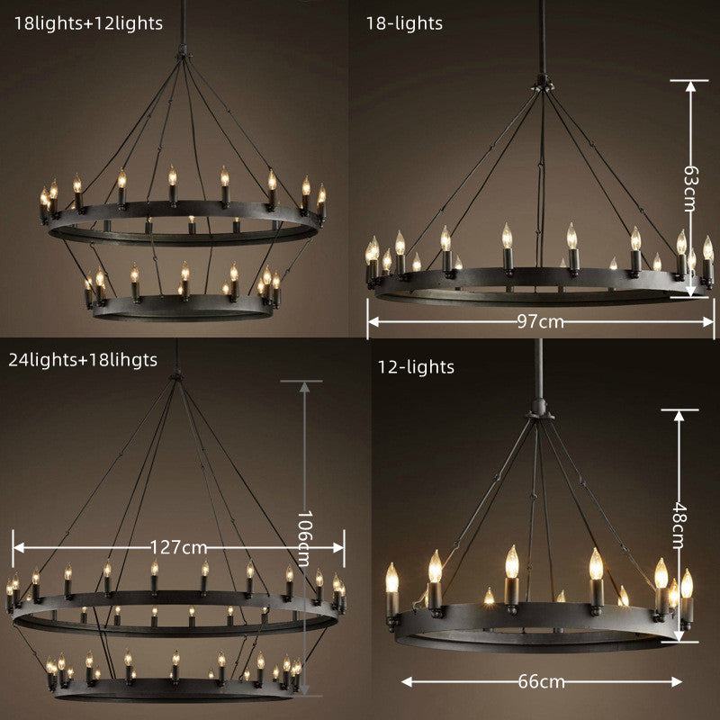 Illuminate your space with the bold, vintage appeal of this Industrial Iron Wagon Wheel Chandelier. Inspired by classic farmhouse and loft aesthetics, this striking fixture features a durable black metal ring frame, perfectly accented with multiple candle-style light holders. Available in various sizes, it offers a dramatic focal point for dining rooms, grand entryways, living rooms, or commercial spaces like restaurants and bars. The sturdy construction and dark finish evoke a rustic, timeless elegance that complements both traditional and modern industrial decor.