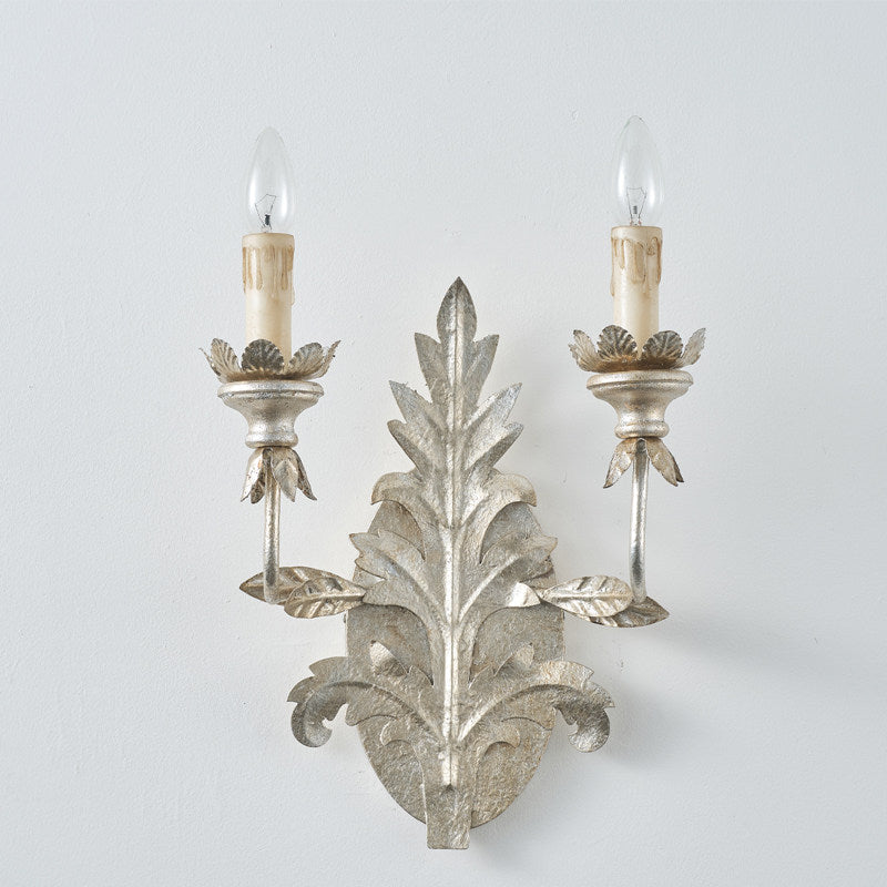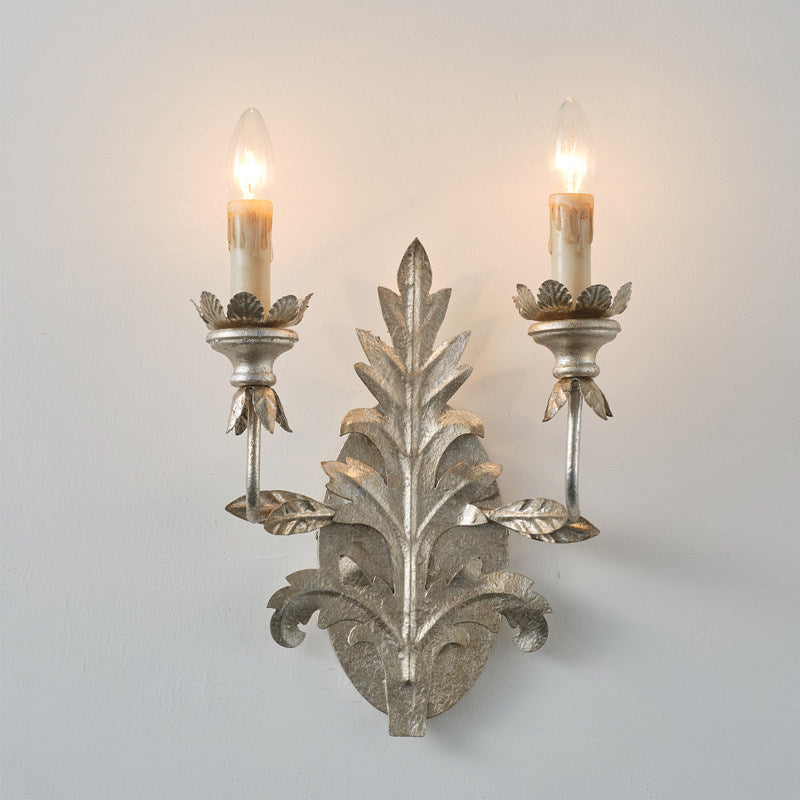 From the ornate central foliage, two elegantly curved arms extend to support vintage candle-style bulb sockets, complete with realistic "dripping wax" detailing on the sleeves. The bulb bases are nestled within scalloped, flower-like cups, adding another layer of intricate detail. This 2-light sconce provides warm, atmospheric lighting while serving as a masterful piece of metal wall art. Perfect for entryways, dining halls, or as a dramatic accent in a classic study.