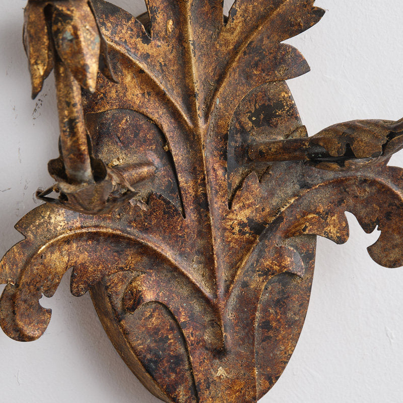 Make a bold architectural statement with this stunning Baroque-inspired Acanthus Leaf Wall Sconce. Crafted to capture the grandeur of antique European estates, this fixture features a central backplate shaped like a majestic, oversized acanthus leaf. The entire piece is finished in a deeply distressed antique gold and bronze patina, giving it an authentic, centuries-old appearance.