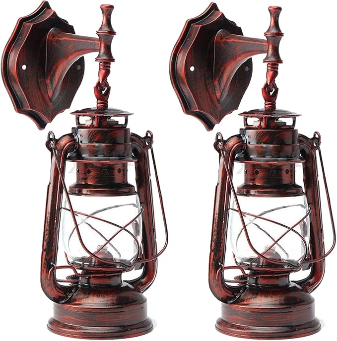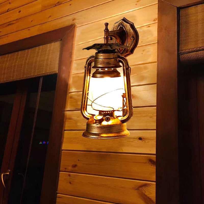 Add a touch of nostalgic charm to your living space with this Vintage Industrial Hurricane Lantern Wall Sconce. Meticulously crafted to mimic the timeless silhouette of a classic kerosene lamp, this fixture combines 19th-century aesthetics with modern electrical convenience. Featuring a rugged metal frame with a weathered bronze/rust finish and a protective wire-caged plastic chimney, it creates a warm, inviting atmosphere perfect for rustic, industrial, or farmhouse-themed interiors.