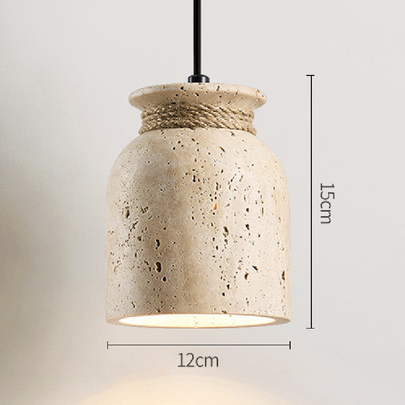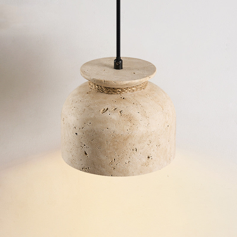 Wabi-Sabi Natural Travertine Stone Pendant Light – Rustic Cream Stone Hanging Lamp with Rope Detail